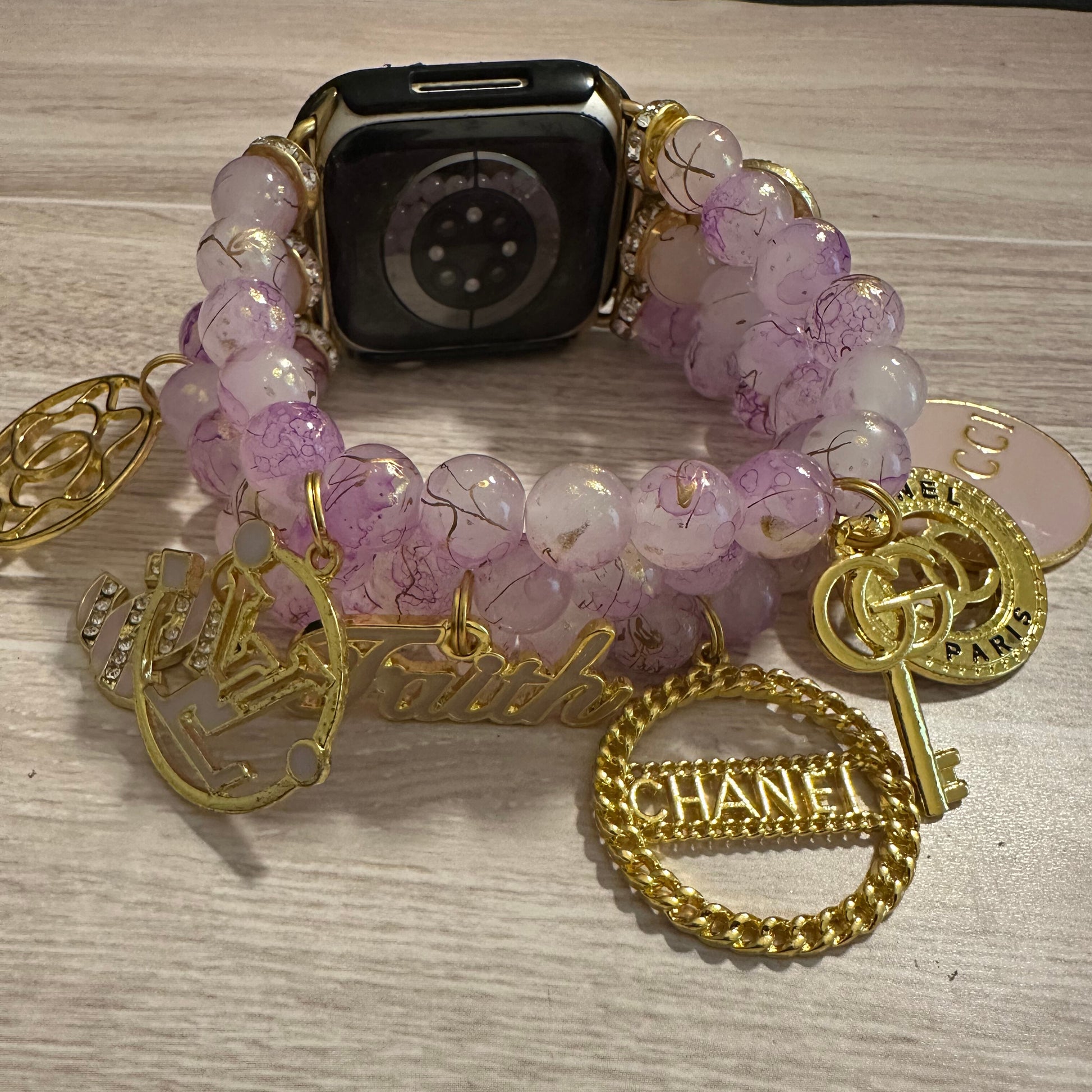 Make a bold yet feminine statement with this lavender beaded Apple Watch band adorned with luxe gold charms. Featuring dreamy crackle-style beads in soft lilac and blush tones with gold foil detailing, this bracelet band is finished with eye-catching gold-tone charms including Chanel, Gucci, Faith, and anchor motifs for a look that blends elegance, inspiration, and high fashion.
