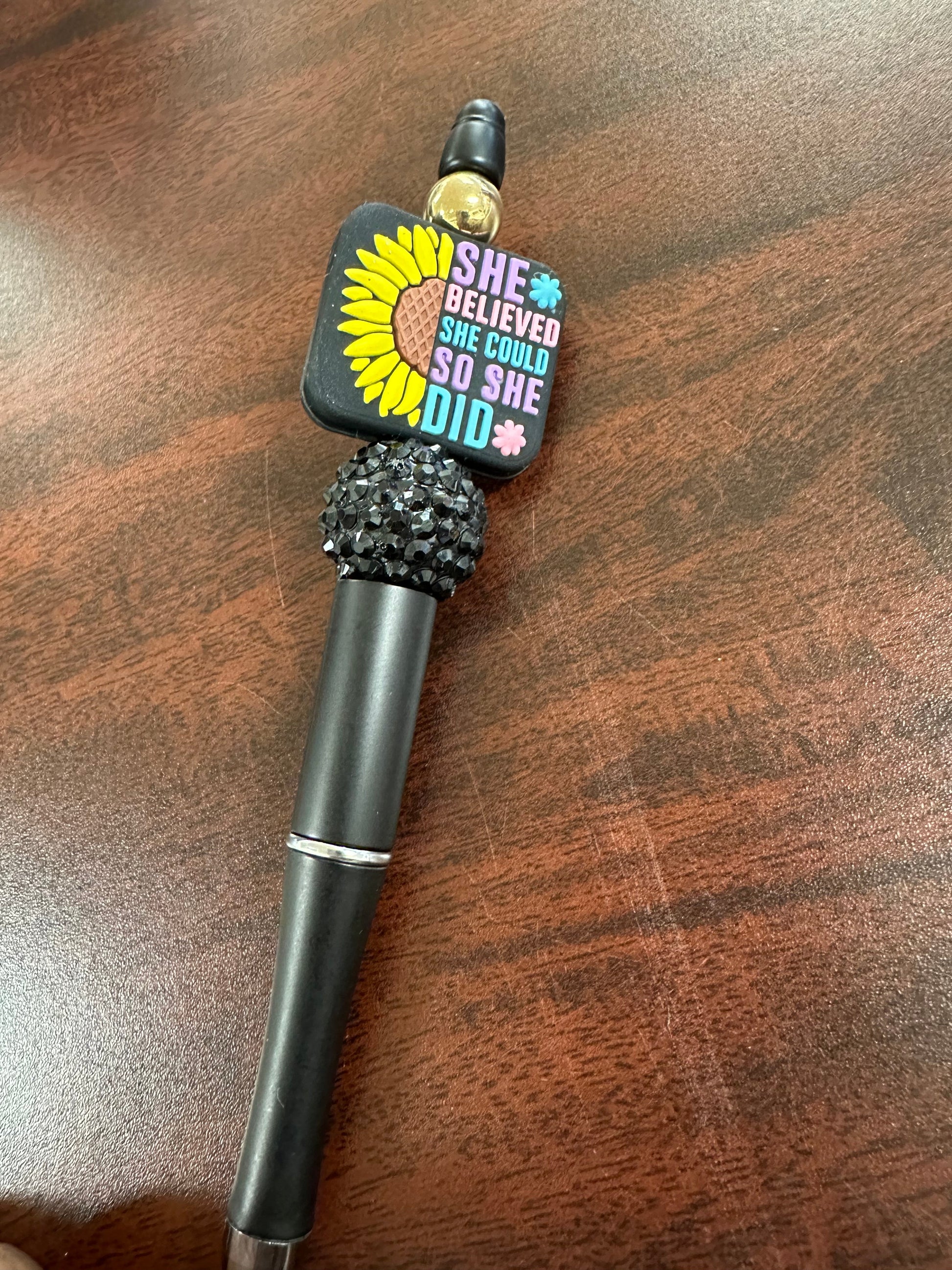 Brighten your day and empower your mindset with this motivational beaded pen featuring a bold yellow barrel, sparkling rhinestone bead, and an inspiring sunflower topper that reads, “She believed she could so she did.” Designed for dreamers, doers, and boss babes, this pen is more than just a writing tool – it’s a daily dose of encouragement.