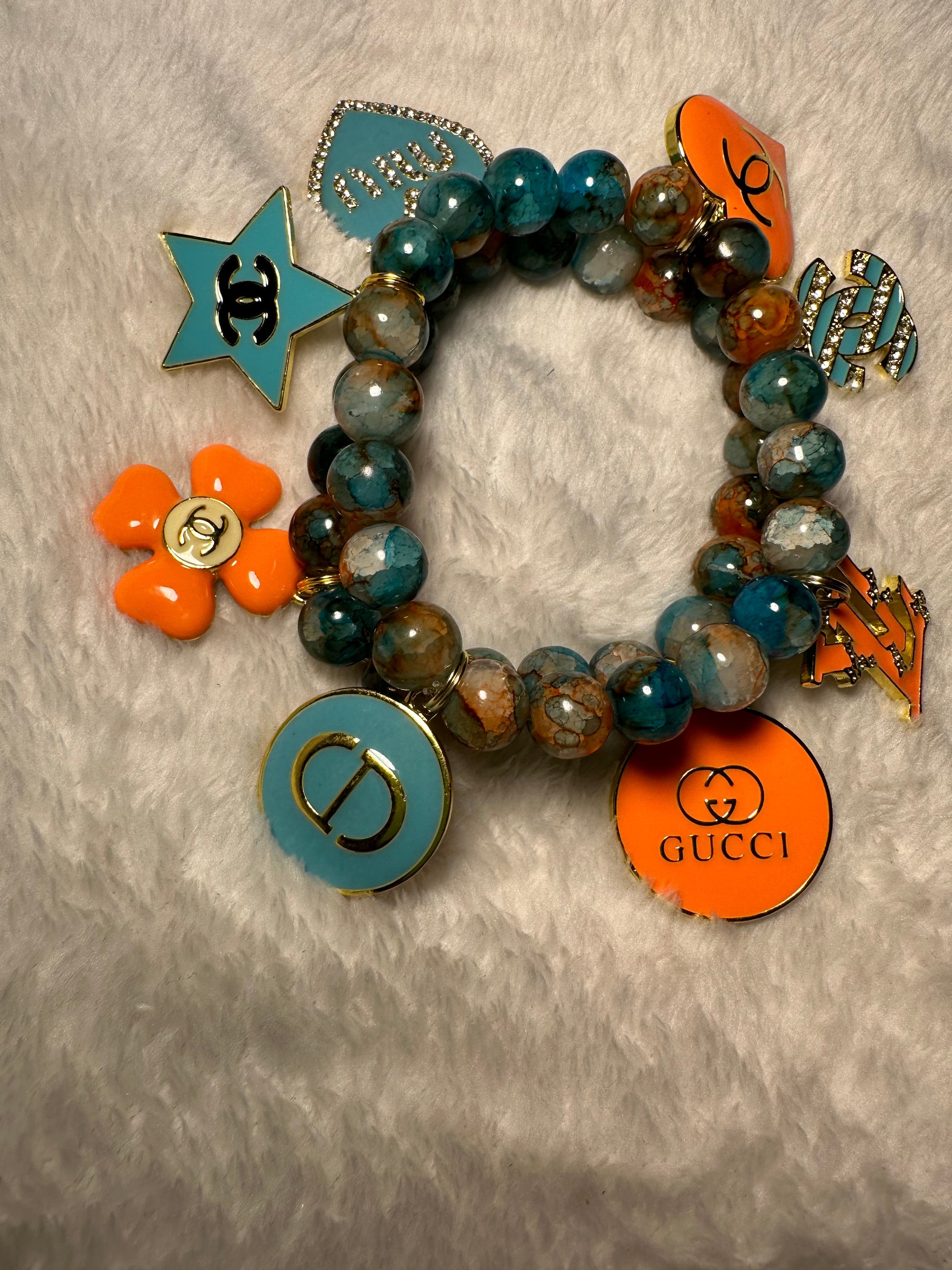 2-Piece bracelet set made with teal/orange 10mm beads and teal and orange charms.